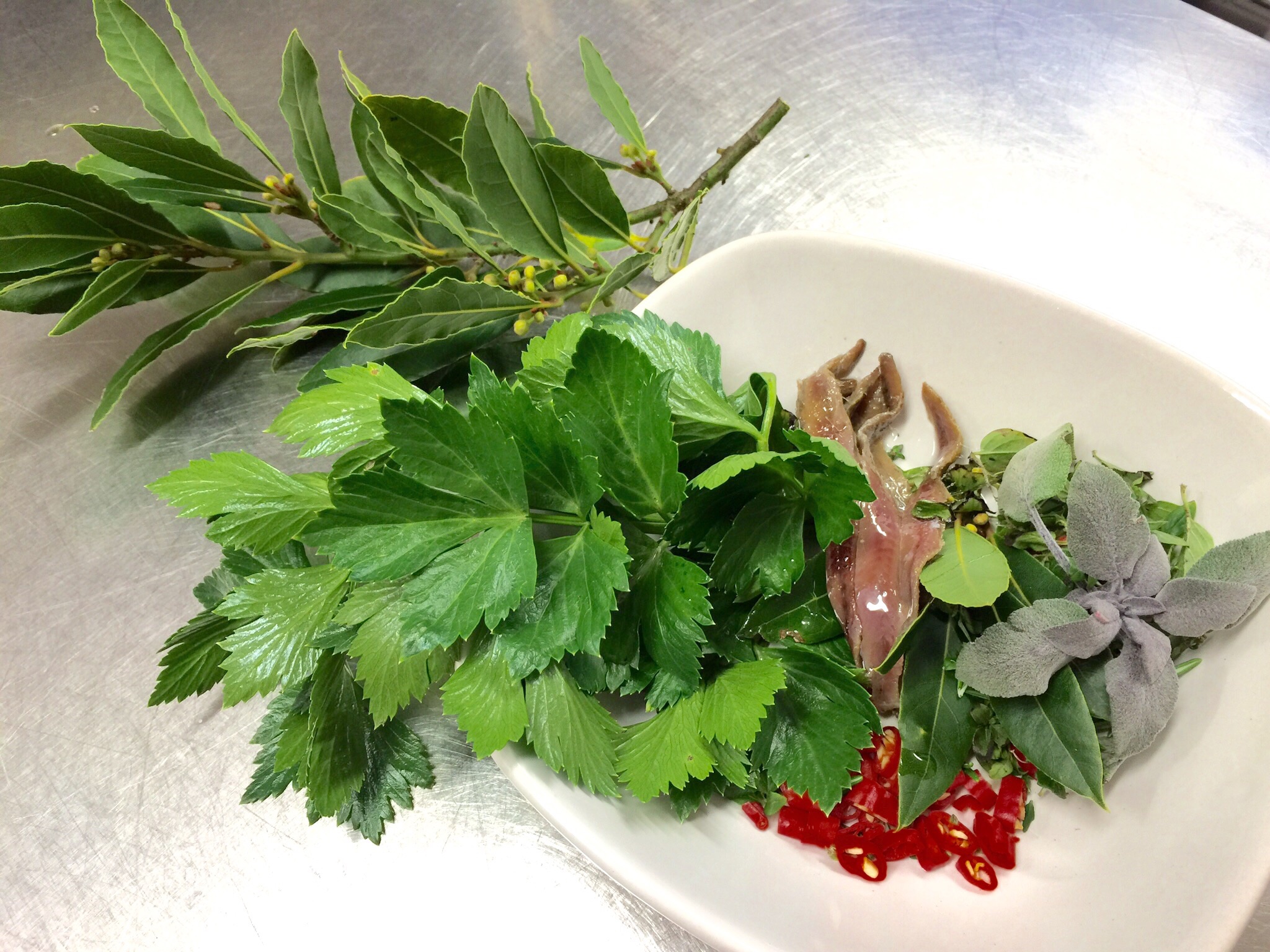 Place the anchovies and other herbs into the hot oil, stirring constantly and reduce the heat, allowing the onion tops and herbs to sweat.