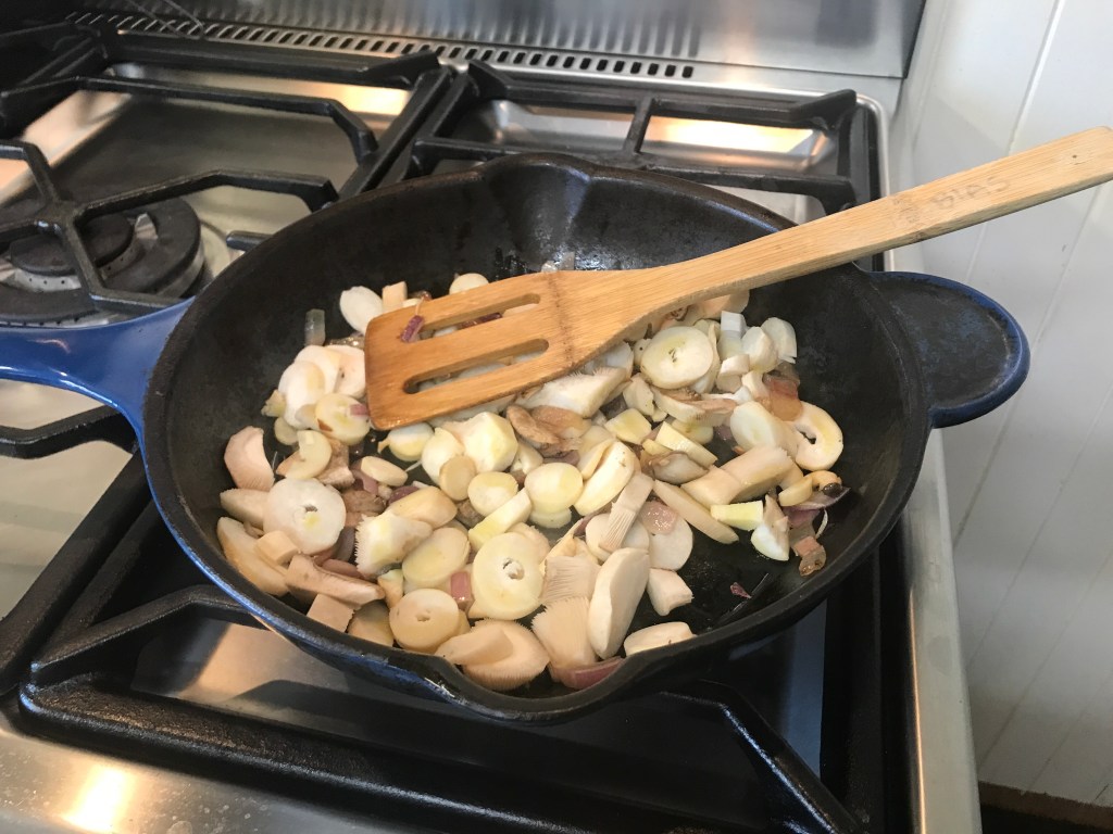 - Add mushroom stems stir gently for 1 minute. Then add the rest of the mushrooms.