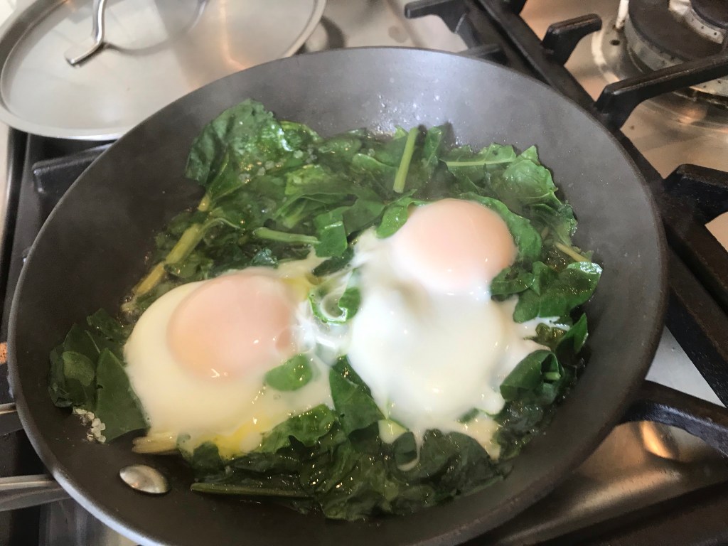 - Place eggs for poaching on top of the spinach and replace the lid.