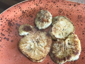 Place mushroom slices in the skillet and cook slowly, until both sides are nice and brown. - When cooked remove from the skillet and set aside.