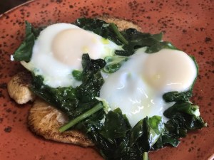 - When the eggs are cooked, dish up your mushrooms onto a warm plate and top with the spinach and eggs.