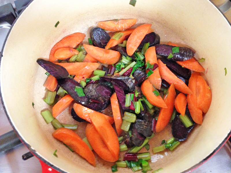- add carrots, salt and pepper, turn heat to lowest setting, stir through and place lid on pan